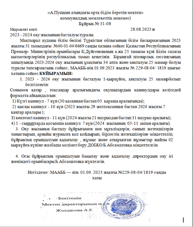 2023-2024 оқу жылының басталуы туралы бұйрығы » Пушкин ЖОМ