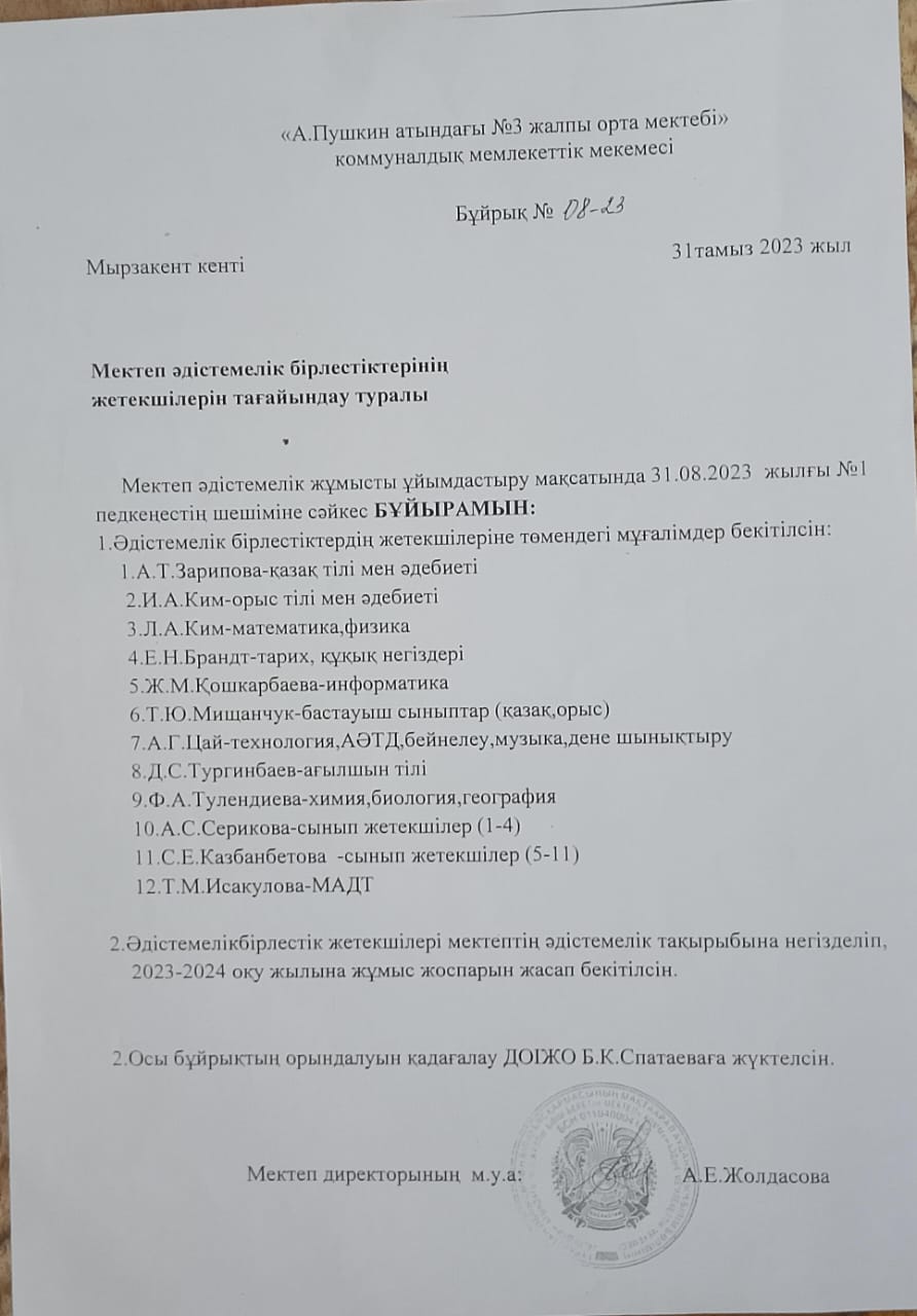 11 август 2025 0 1 2 3 4 5 2023-2024 оқу жылына арналған мектеп әдістемелік жетекшілерін бекіту туралы бұйрық